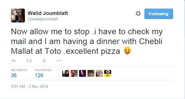 "وليد بك ذويق بالأكل"، هذا ما كشفه موقع "تويتر" الذي انضمّ إليه النائب جنبلاط أخيرًا، نازعًا عنه هالة البكويّة، ومقرّبًا نفسه من الناس.