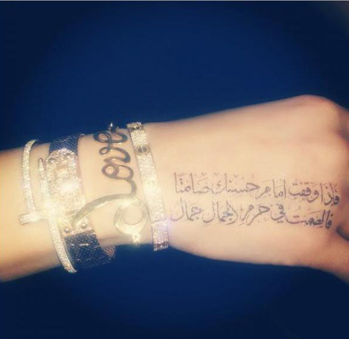 عبرت النجمة هيفا وهبي عن سعادتها واعجابها بالوشم الجديد على يدها، وهو بيت شعر للشاعر نزار قباني: "فإذا وقفت أمام حسنك صامتاً.. فالصمت في حرم الجمال جمال".