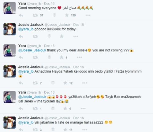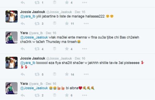 وبدردشة ليارا مع منتجة برنامج " هيدا حكي"، قالت الصحافية جوسلين جعلوق ليارا " اخذتي منا فريق عمل هيدا حكي من سيصور الحلقة؟!"، فردت يارا عليها :" معزومة على العرس ما تقولي لأ".. ارفعي شعرك وتعي الخميس". والمقصود بالتغريدات هو مقدم البرنامح عادل كرم الذي يشارك يارا في كليبها الجديد، الذي كما يبدو فإنه يتمحور حول قصة حب تنتهي بالزواج بين يارا وكرم.