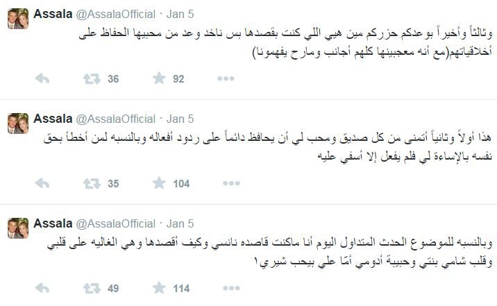 وردَّت أصالة على كل الإتهامات التي طالتها عبر حسابها على تويتر قائلةً:”بالنسبة للموضوع الحدث المتداول اليوم أنا ما كنت قاصدة نانسي وكيف أقصدها وهي الغالية على قلبي وقلب شامي بنتي وحبيبة أدومي أمّا علي بيحب شيرين”.