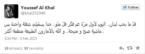 وأعلن الخال أنّه يفكّر ولأول مرّة بالسفر الى الخارج، وكتب: "قدّ ما بحب لبنان.. اليوم لأول مرّة عم فكّر فلّ منّو.. حدا يسمّيلي شغلة واحدة بس ماشية صح ومنيحة.. و الله بالأمازون الطبيعة منظمة أكتر..".