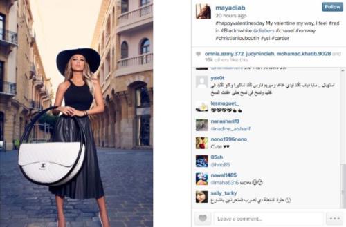 وهنأت دياب متابعيها بمناسبة يوم الحب وعلقت: "أتمنى لكم يوم (فالنتاين) سعيد، لكنني أجعل هذا اليوم على طريقتي، أعيش اللون الأحمر بالأبيض والأسود".
