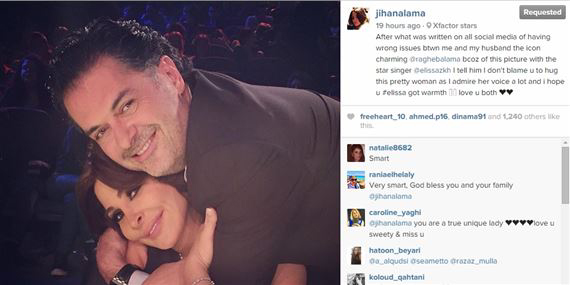 بدورها أعادت جيهان نشر الصورة التي أثارت الجدل، وعلقت عليها قائلةً: «بعد كل ما كُتب عبر مواقع التواصل الاجتماعي عن وجود خلاف بيني وبين زوجي راغب علامة بسبب هذه الصورة مع النجمة إليسا، قلت له أني لا ألومك على احتضان هذه المرأة الجميلة، لأني معجبة بصوتها جداً، أتمنى لكي الدفء إليسا، أحبكم أنتم الأثنين».