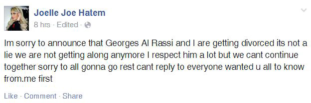 وكتبت حاتم على صفحتها في فايسبوك: "أُعلن عن طلاقي أنا وجورج الراسي، هي ليست كذبة، فأنا وجورج لا يمكننا البقاء سوياً، أنا أحترمه كثيراً".