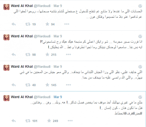 طلبت الممثلة ورد الخال من متابعيها على حسابها الخاص على تويتر، عدم التواصل معها او متابعتها، اذا كانوا من محبي الفنان الهارب من العدالة فضل شاكر. وغردت قائلة: "انا قررت صير مجرمة ... شو رايكن اعملي كم مذبحة هيك هيك رح تسامحوني؟! .. في رد على اعلان شاكر في مقابلة اجريت معه اخيرا عزمه العودة الى حياته الطبيعية.