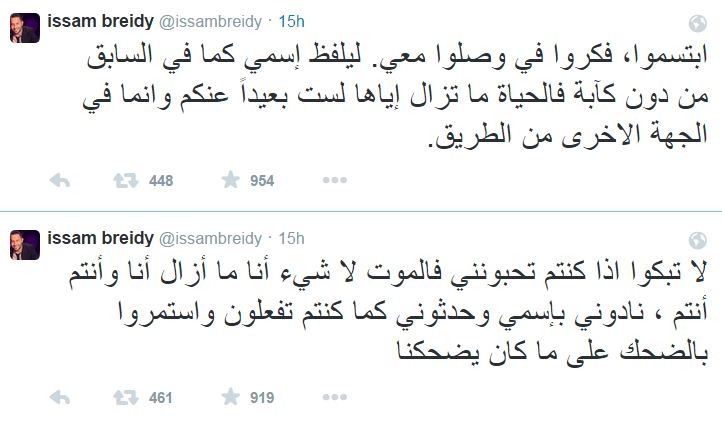 فُتح مجدداً حساب الممثل الراحل عصام بريدي حيث كتب المسؤول عن الحساب رسالة من روح عصام إلى كل محبيه وقد جاء فيها: “لا تبكوا اذا كنتم تحبونني فالموت لا شيء أنا ما أزال أنا وأنتم أنتم، نادوني بإسمي وحدثوني كما كنتم تفعلون واستمروا بالضحك على ما كان يضحكنا".