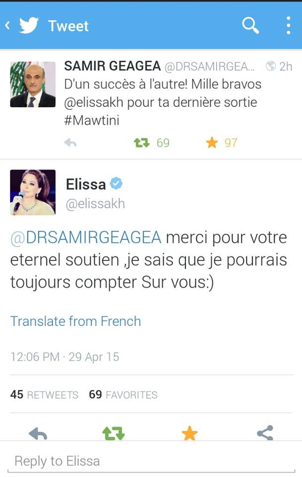 هنّأ رئيس حزب "القوات اللبنانية" سمير جعجع الفنانة إليسا من خلال تغريدة عبر حسابه الخاص على موقع "تويتر" قائلاً: "من نجاح إلى آخر، ألف تهنئة إليسا على أغنيتك الأخيرة "موطني"." وردّت إليسا بتغريدة قائلةً: "جعجع، شكراً لدعمكم الأبدي، أعرف أنني أستطيع دائماً الإتكال عليكم."