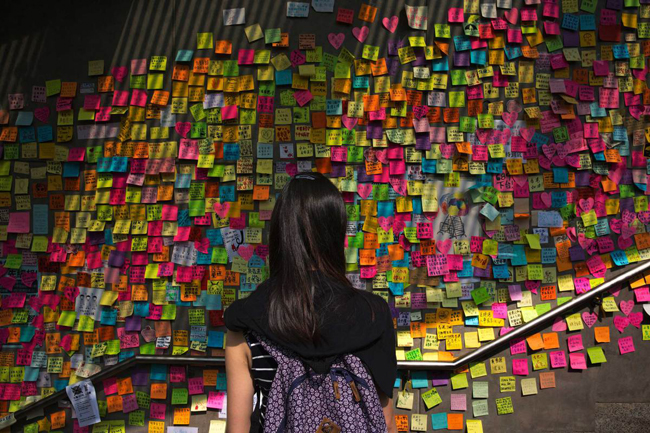 فتاة تقرأ رسائل تشجيع في هونغ كونغ