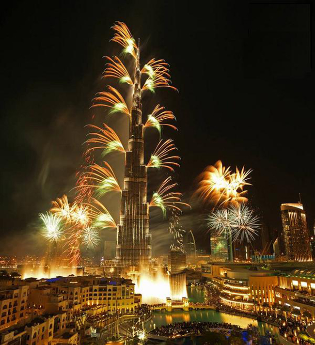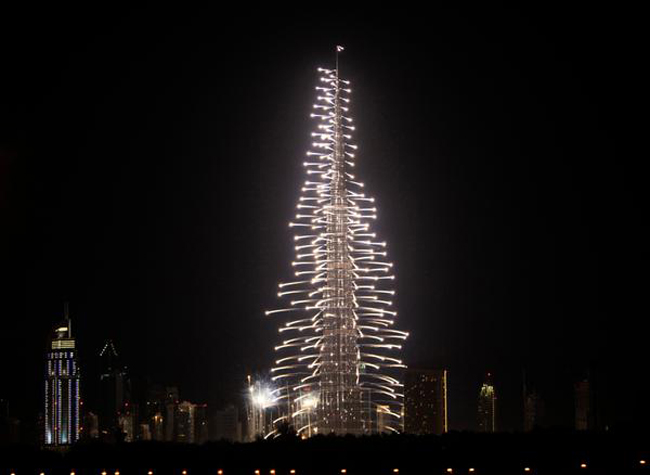 واشتعل برج خليفة البالغ ارتفاعه 828 مترا بالاضواء في استعراض ضوئي وصفته شركة اعمار بانية البرج بانه لا سابق له في العالم.