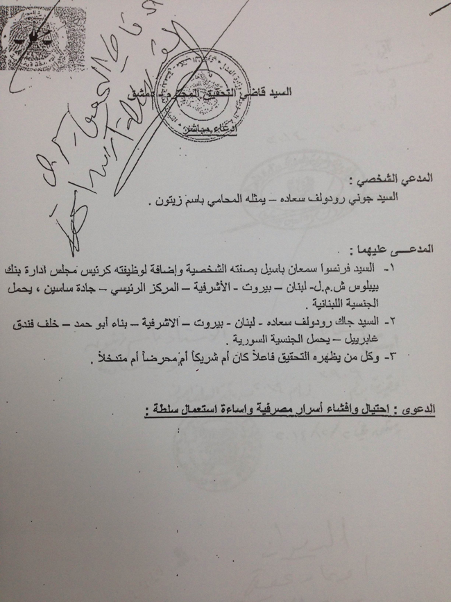 بتاريخ 2/12/2014 إدعى النائب العام في دمشق على رئيس مجلس إدارة بنك بيبلوس ش.م.ل. فرنسوا سمعان باسيل وعلى جاك سعاده ، بجرم الإحتيال كما إدعى بتاريخ 29/12/2014 على مدير عام بنك بيبلوس ش.م.ل. وعلى رودولف جاك سعاده وأحالهم أمام قاضي التحقيق في دمشق نتيجة الدعوى المقدّمة من السيد جوني رودولف سعاده بحقهم بموضوع الإحتيال وإفشاء أسرار مصرفية وإساءة إستعمال السلطة بعد قيامهم بالإتفاق ، ماديا"، والتواطؤ فيما بينهم بهدف شلّ العمل في مشروع يعود الى أحدى شركات المدعي التي تتعاطى التطوير العقاري في بيروت.