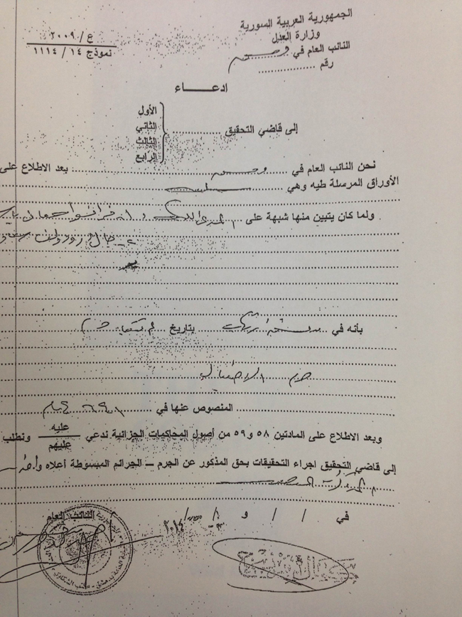 وقد أصدر قاضي التحقيق في دمشق مذكّرة قضائية تتضمّن دعوة كلّ من المدعى عليهم الى جلسة تعقد أمامه، ثاني يوم التبليغ وذلك لإستجوابهم في ما نسب اليهم من جرائم.