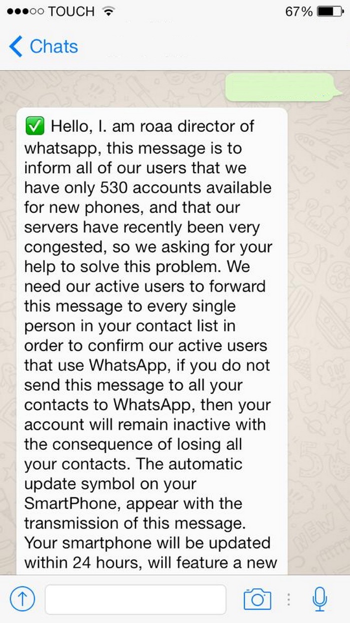 ويطلب هؤلاء من المستخدمين إرسال الرسالة الى جميع الاشخاص في قائمة الاتصال الخاصة بهم، من أجل التأكد من مدى فعاليتهم ونشاطهم على التطبيق، لا سيما وأن هناك فقط 530 حساباً متاحاً متبقياً للهواتف الجديدة. وفي حال عدم ارسالها، سوف تتحول حسابات المستخدمين الى حسابات غير فعالة مع امكانية فقدان قائمة الاصدقاء. كما تشير الرسالة الى أن تحديثاً سيطرأ على التطبيق في غضون 24 ساعة يشمل تصميماً جديداً ولوناً جديداً.