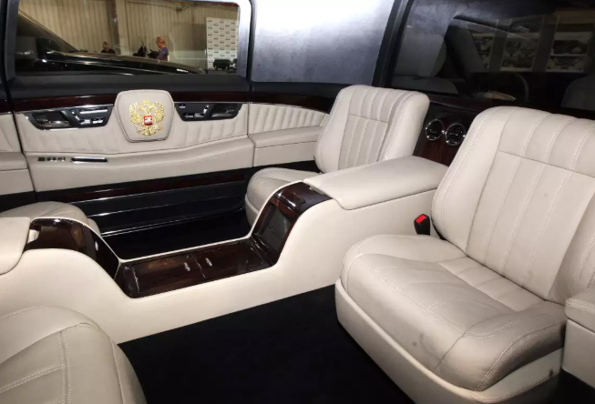 وفي الداخل، زيّنت سيارة الليموزين بمقاعد جلدية بيضاء وتفاصيل من الخشب، وتحتوي على أنواع كثيرة من الأسلحة الروسية المثبتة في الباب.