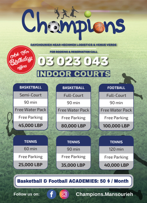 Champions Courts - Mansourieh - Tennis - Basketball - Football - You can contact us through the following Mobile: +961 3 023 043
