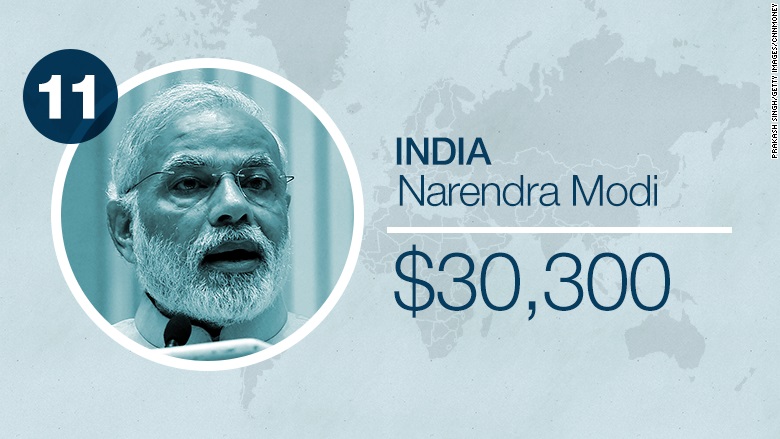 في المقابل، فإنّ الرواتب تختلف بنسبة كبيرة بين الدول الغنية والدول النامية، حيث يتلقى رئيس الوزراء الهندي 1.6 مليون روبية شهريا، أي أكثر من 30 ألف دولار سنويا، وذلك طبقا لمستندات رسمية قدمت إلى وسائل إعلام محلية من منطلق "حرية المعلومات"