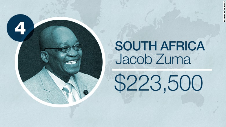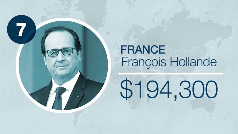 وفي المرتبة الرابعة، كان الرئيس الفرنسي فرنسوا هولاند الذي كان يفترض أن يتربع على مرتبة أعلى بكثير لولا قراره بخفض راتبه 30 في المئة لحظة توليه الرئاسة عام 2012. وانخفض راتب فرانسوا هولاند السنوي بهذا القرار من 255,600 يورو إلى 194,251 يورو.