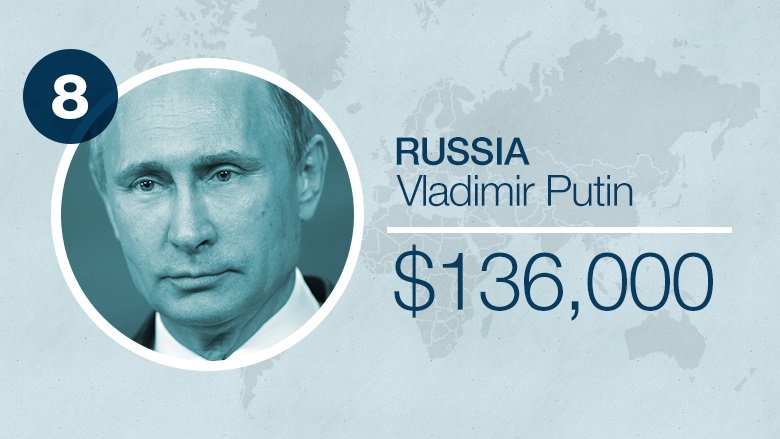 أما الرئيس الروسي فلاديمير بوتين، فيبلغ راتبه اليوم 8.2 مليون روبل (136 ألف دولار) في السنة.