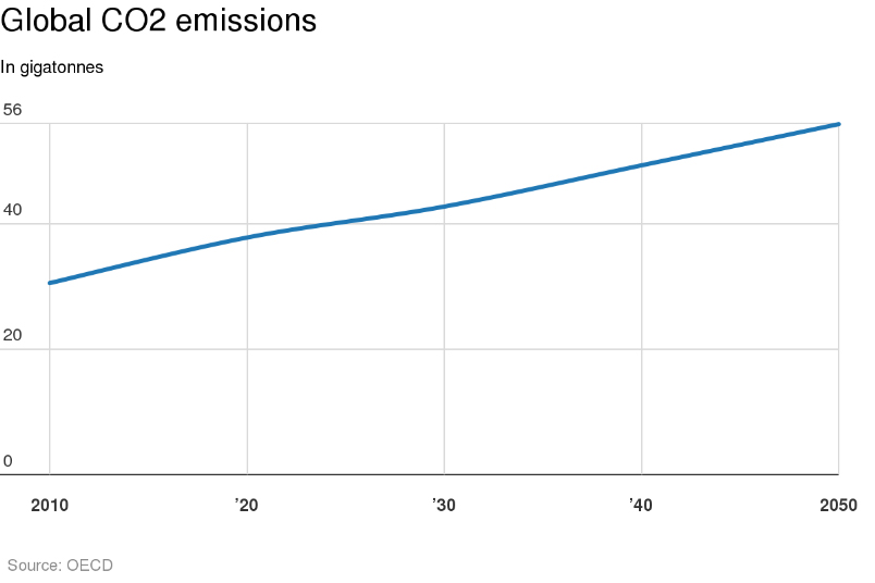 ففي العام 2050، سوف يتزايد انبعاث ثاني أكسيد الكربون بوتيرة ثابتة على مستوى العالم.