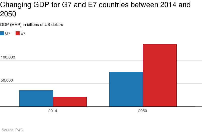 وبحسب التقرير، سوف يجتاز الناتج المحلي الإجمالي للدول ذات الاقتصادات الناشئة التي تشمل الصين والهند والبرازيل والمكسيك وروسيا وإندونيسيا وتركيا على دول مجموعة السبع الحالية التي تضم كندا وفرنسا وألمانيا وإيطاليا واليابان والمملكة المتحدة وأمريكا بحلول العام 2050.