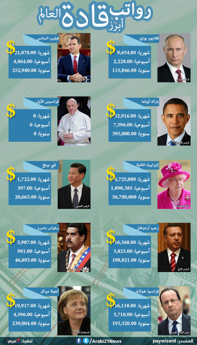 تتفاوت رواتب زعماء العالم حسب البلد الذي يحكمونه، وأحياناً حسب الوظائف التي يؤدونها، فقد يكون منصب الرئيس شرفياً في دولة، وحساساً في أخرى.
