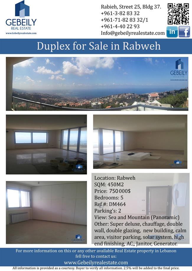 Located in the neighborhood of Rabweh, the apartment consists of 2 Master Bedroom, 3 Regular Bedrooms, 5 Bathrooms, 2 Salons, 1 Dining, 3 Balconies, 1 Maid’s Room with its own bathroom, 2 Underground Parking Spots.