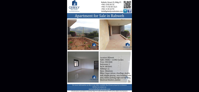Located in the neighborhood of Rabweh, the apartment consists of 1 Master Bedroom, 2 Regular Bedrooms, 3 Bathrooms, 2 Salons, 1 Dining, 2 Balconies, 1 Maid’s Room with its own bathroom, 2 Underground Parking Spots . View: Mountain Other: Super Deluxe,123m2 Garden, Chauffage, Double Wall, Double Glazing, New Building, Maid Room, Calm Area, Visitor Parking, High end finishing, Electrical Shutters, Janitor.