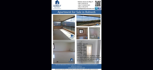 Located in the neighborhood of Rabweh, the apartment consists of 1 Master Bedroom, 2 Regular Bedrooms, 3 Bathrooms, 2 Salons, 1 Dining,3 Balconies, 1 Maid’s Room with its own bathroom, 2 Underground Parking Spots . View: Mountain Other: Super Deluxe, Chauffage, Double Wall, Double Glazing, New Building, Maid Room, Calm Area, Visitor Parking, High end finishing, Electrical Shutters, Janitor.