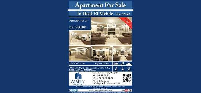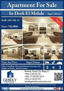 The apartment is in a new building fully decorated from the inside and the outside. http://www.gebeilyrealestate.com/gebeily/property/110/